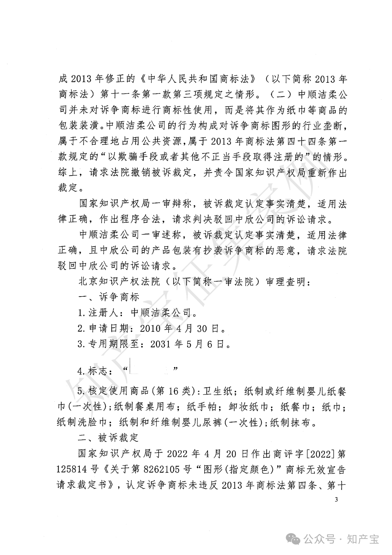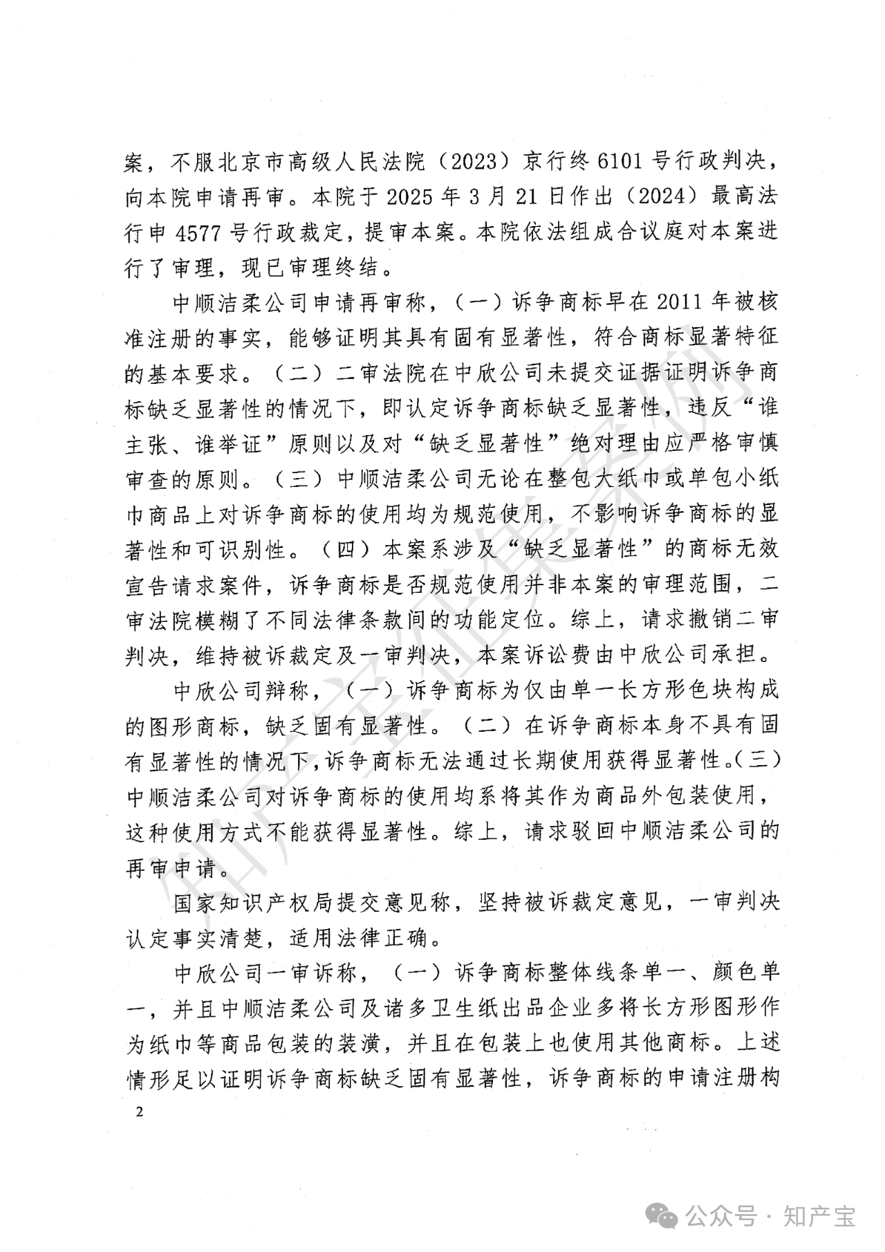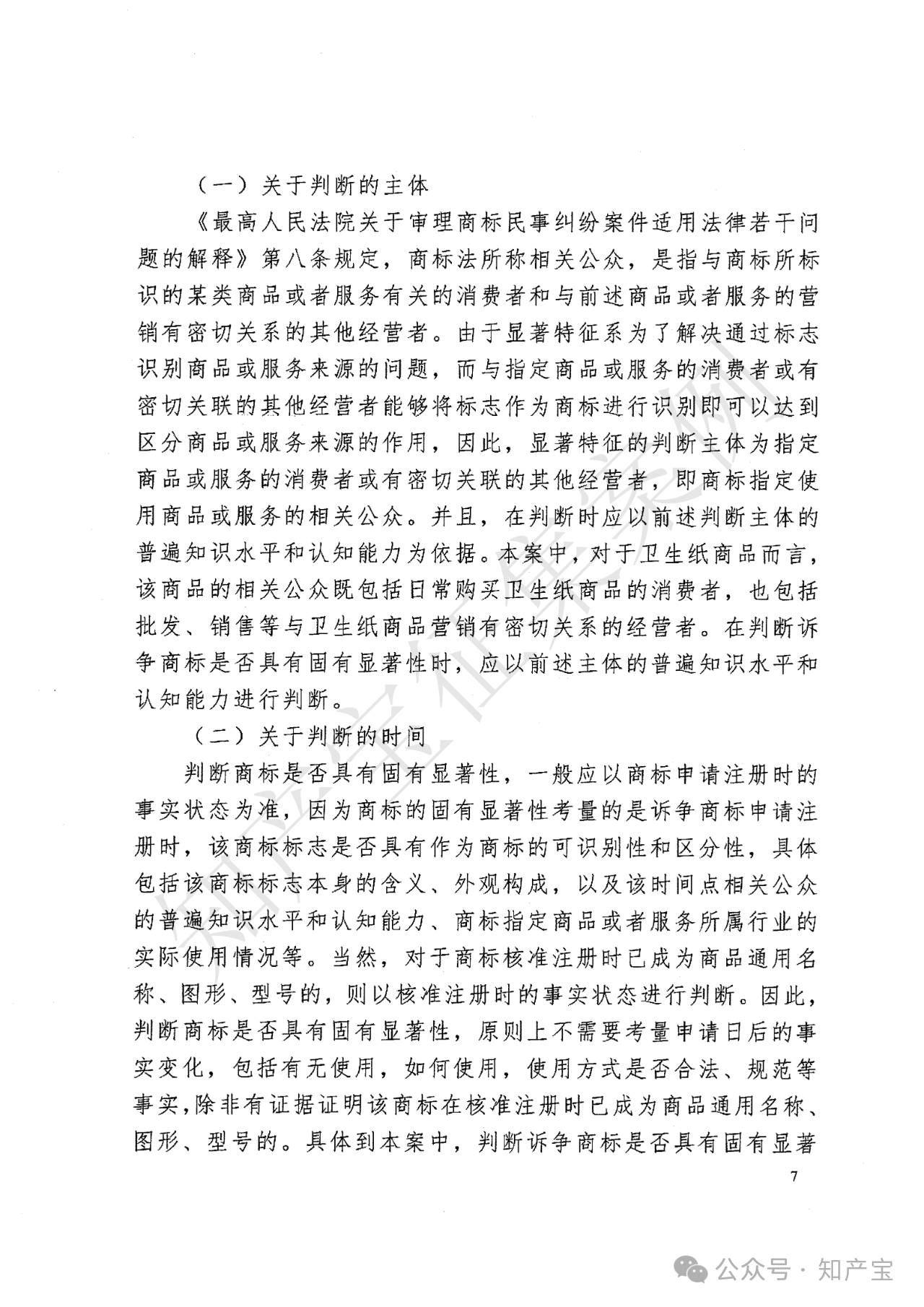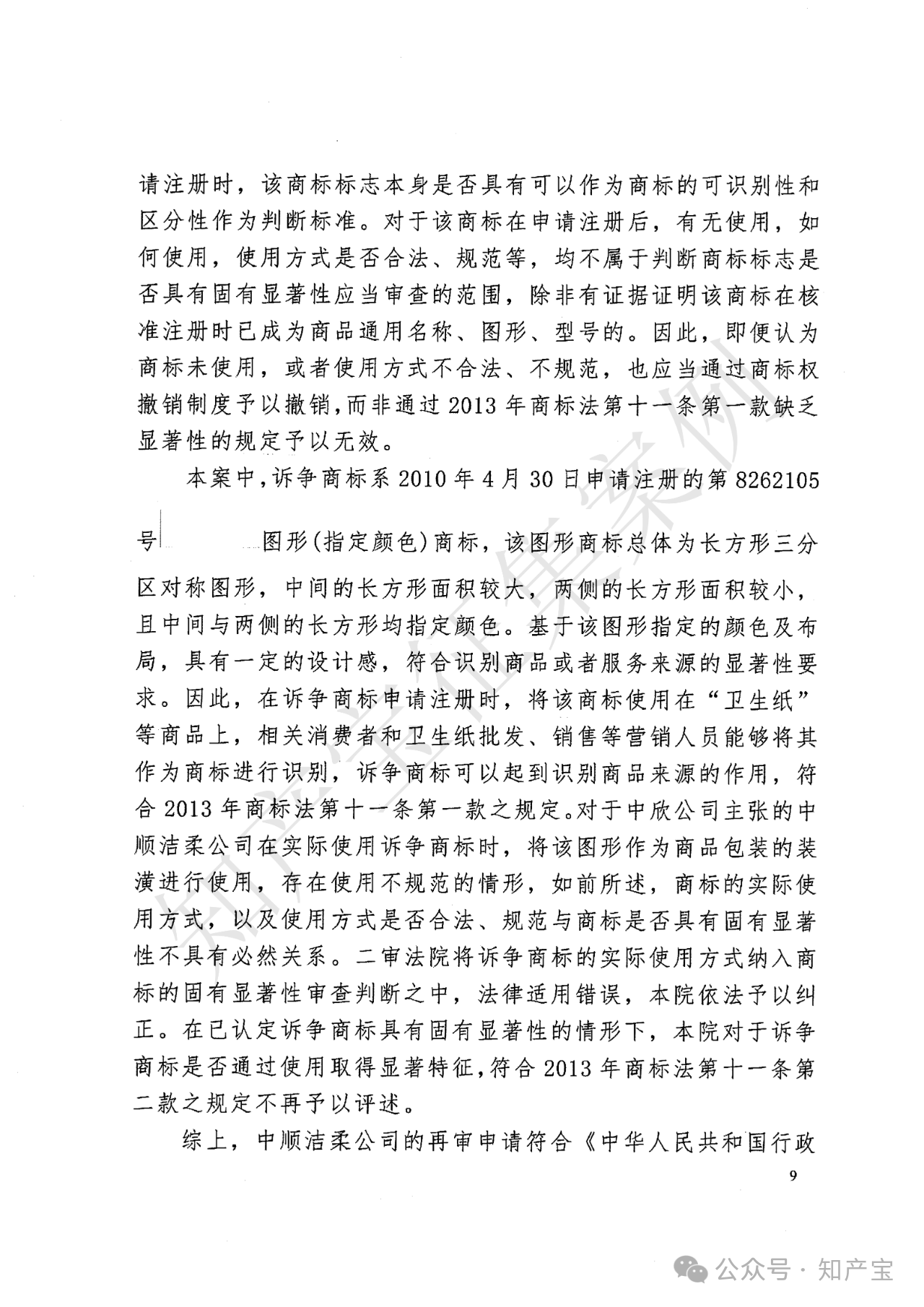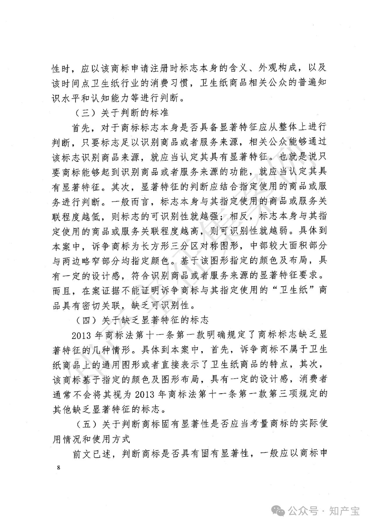 本案再审裁判观点认为:诉争商标是否违反2013年《商标法》第十一条第一款,需围绕显著特征判断主体、时间、标准及实际使用影响展开。其一,判断主体为商标指定商品的相关公众(即卫生纸消费者及营销经营者),以其普遍知识水平和认知能力为依据;其二,固有显著性判断原则上以商标申请注册时的事实状态为准,考量标志本身含义、外观及相关公众当时认知,无需事后使用情况;其三,判断标准需整体审视标志能否识别商品来源,结合指定商品关联度,本案诉争商标为长方形三分区对称指定颜色图形,有设计感,与“卫生纸”关联弱,能识别来源;其四,诉争商标非卫生纸通用图形或直接描述商品特点,有设计感,不属第十一条第一款第三项“其他缺乏显著特征”情形;其五,商标实际使用方式(如作为装潢)及规范性不影响固有显著性审查,未规范使用应通过撤销制度解决,非第十一条第一款无效事由,二审错误考量使用方式,依法纠正。综上,诉争商标申请注册时具有固有显著性,符合《商标法》第十一条第一款规定。