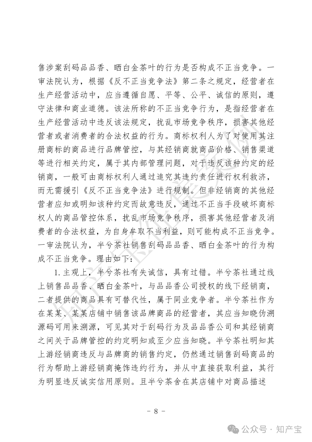 原告品品香品牌主营白茶产品,在2012年被相关机构认定为驰名商标。同时,品品香公司建立“一品一码”完善的产品质量安全可追溯管理制度,该制度是可追溯和防伪系统,能够为该公司和消费者提供识别、追溯商品来源以及辨别真伪的便利。被告半兮茶舍在网络运营店铺中销售刮掉溯源码、防伪码的品品香品牌白茶商品。品品香品牌茶叶公司主张被告刮码销售的行为构成商标权侵权及不正当竞争。