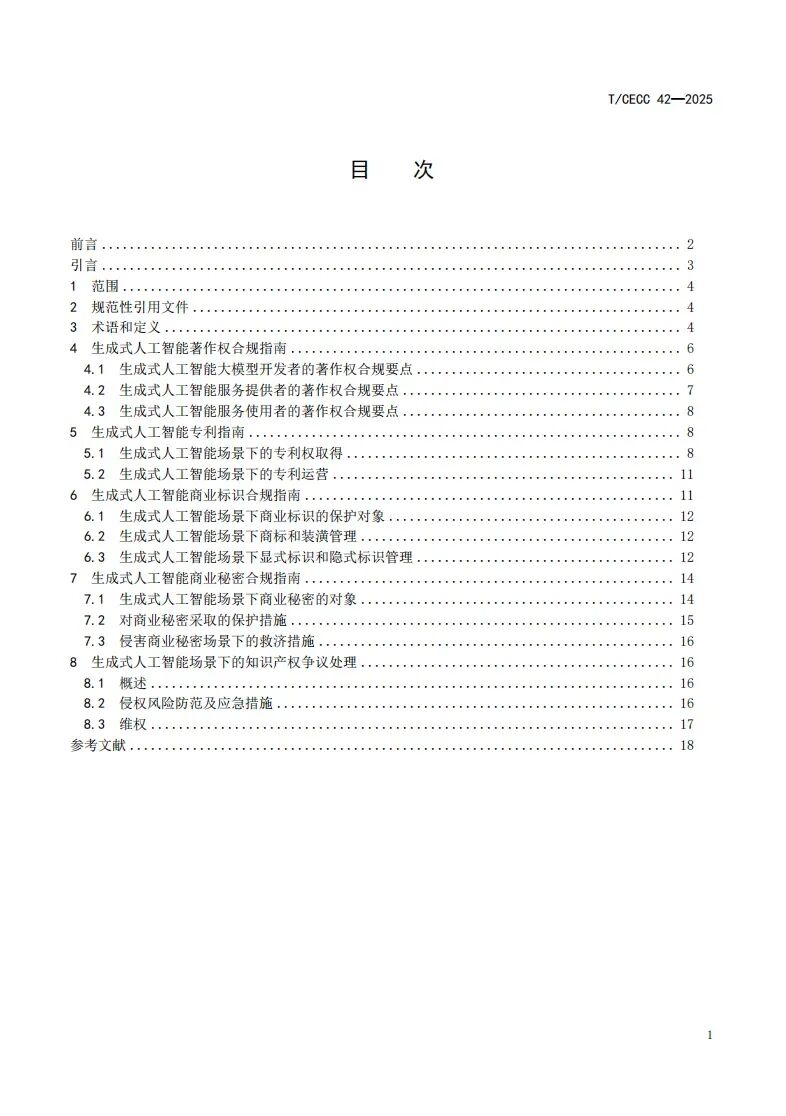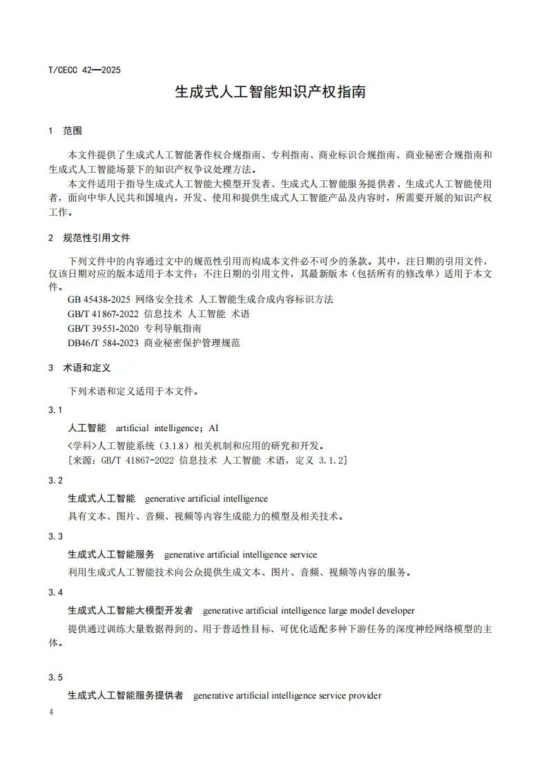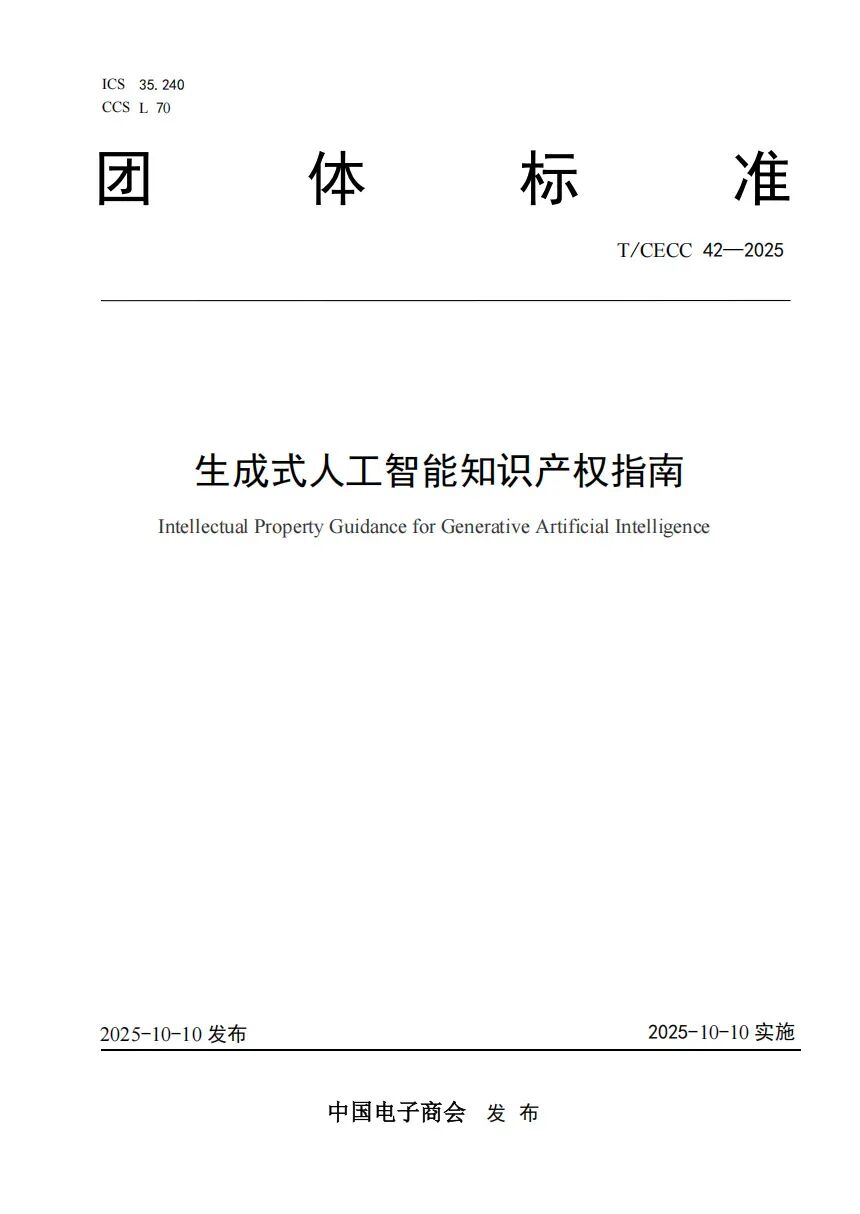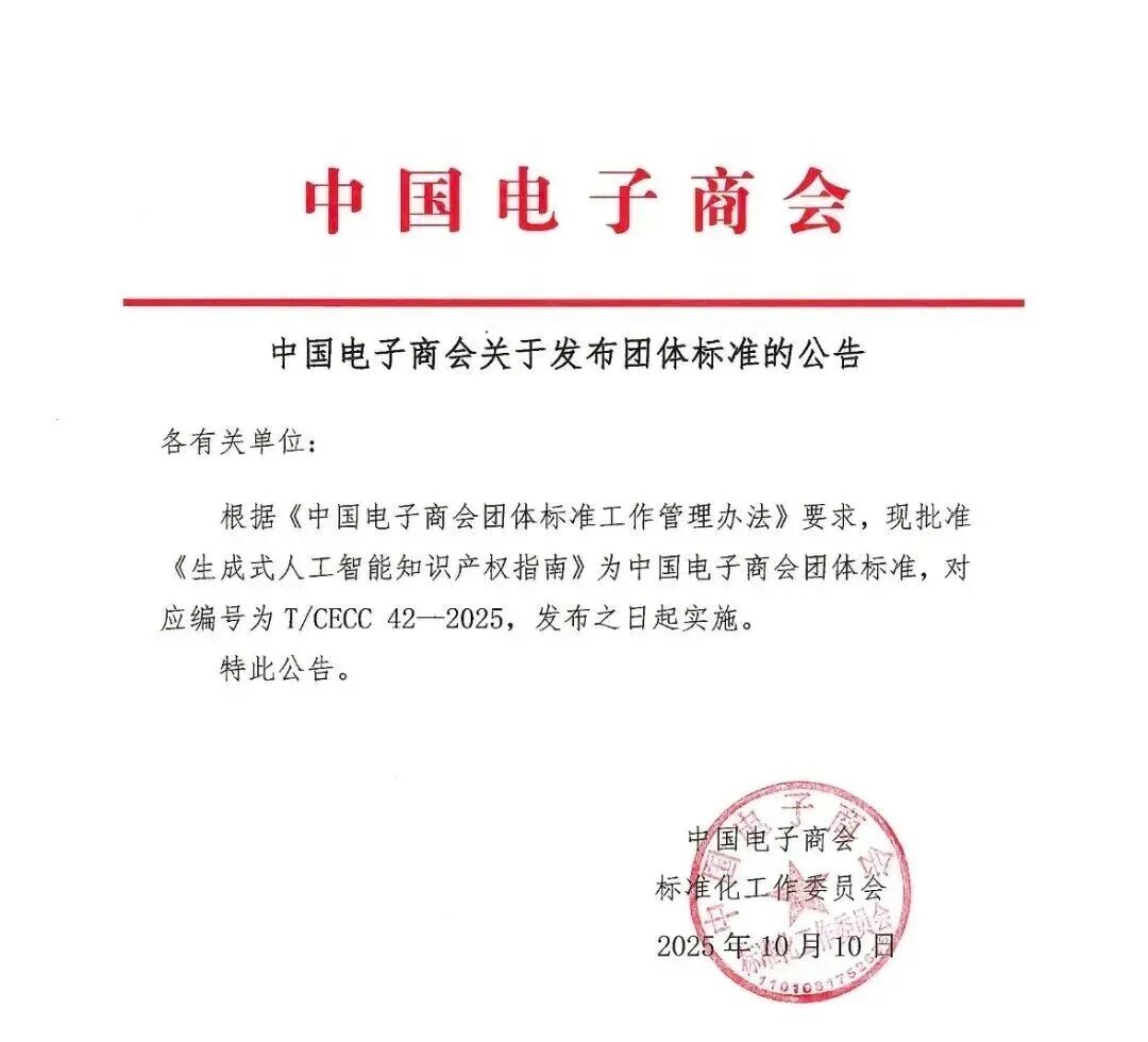 更多 >>近日,中国电子商会正式发布国内首部聚焦生成式人工智能领域的知识产权团体标准——《生成式人工智能知识产权指南》(T/CECC 42-2025)(以下简称《标准》)。该《标准》作为“标准化+市场监管”团体标准典型案例在海淀区第56届“世界标准日”主题活动暨第四届标准创新大会上进行展示。