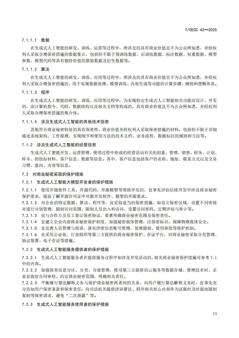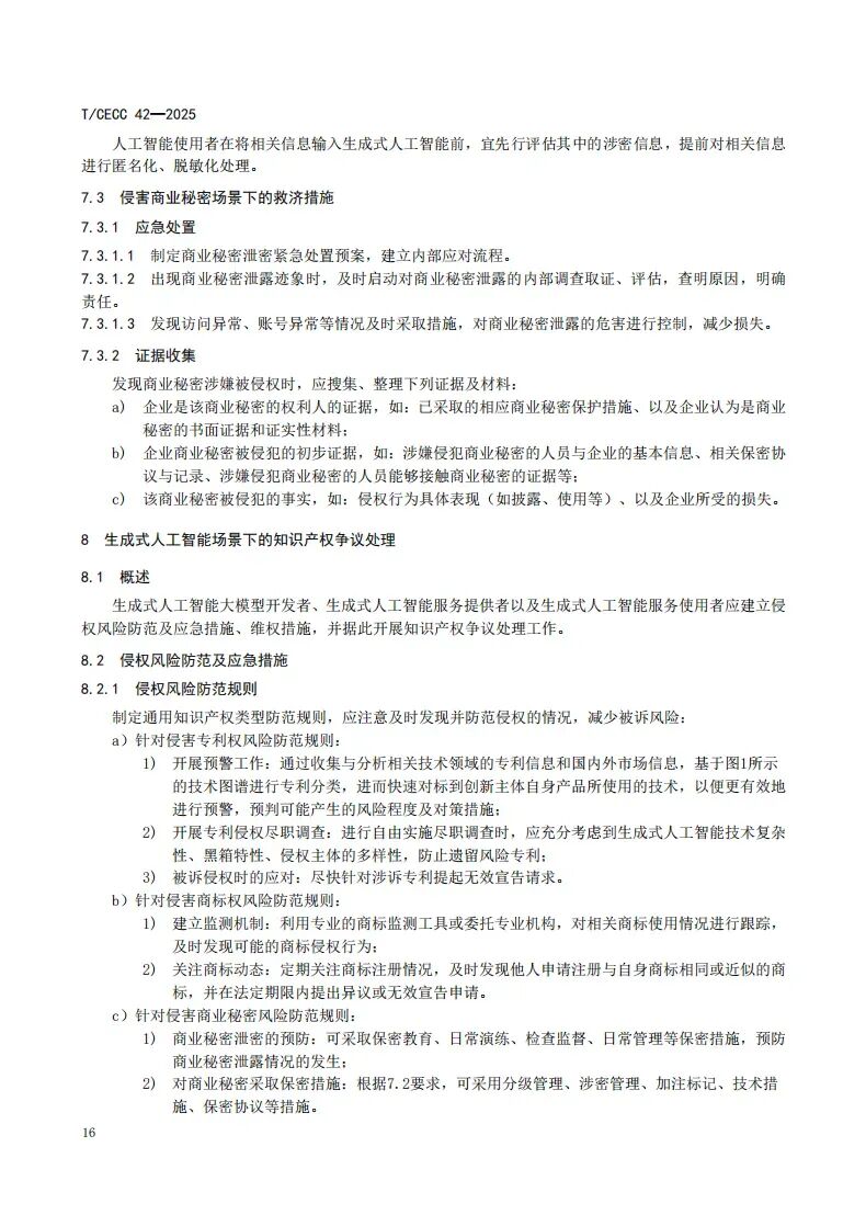 《标准》已于2025年10月10日起正式实施,为生成式人工智能不同场景下的主体提供了明确的应用价值:生成式人工智能大模型开发者可依指南明确数据合规、专利保护、商业秘密管理要点,降低侵权风险;生成式人工智能服务提供者可依指南开展大模型审查、投诉渠道搭建等业务,平衡服务效率与知识产权保护;生成式人工智能服务使用者可依指南在使用前进行规范的信息确认、在使用中合理有效留痕,厘清合规边界。《标准》还专门设有知识产权争议处理专章,为各主体提供侵权风险防范、应急措施及多元维权途径,助力各方主体高效应对知识产权纠纷。