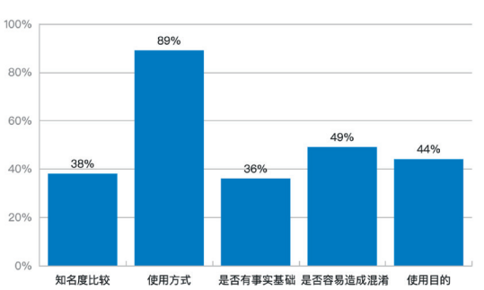 本文以中国裁判文书网为检索平台,以地名商标、正当使用为关键词,检索知识产权权属、侵权纠纷案由的相关案件,共计46件。经分析发现,法院在判断被诉侵权主体对地名标识的使用是否构成正当使用时,主要考虑以下五个因素:是否有事实基础、地名商标与地名的知名度比较、使用方式、使用目的、是否容易造成混淆。从单个考量因素占比情况看,38%的案件考虑了地名商标与地名的知名度对比,89%的案件考虑了使用方式,36%的案件考虑了被诉侵权主体使用地名标识是否有事实基础,49%的案件考虑了使用结果是否容易造成混淆,44%的案件考虑了使用目的是否善意。(图1)