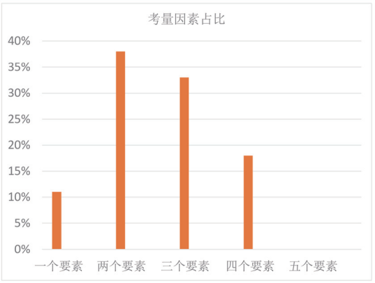 从考量因素不同组合的情况看,11%的案件仅考虑了一个要素,38%的案件考虑了两个要素,33%的案件考虑了三个要素,18%的案件考虑了四个要素,尚无案件考虑五个要素。(图2)