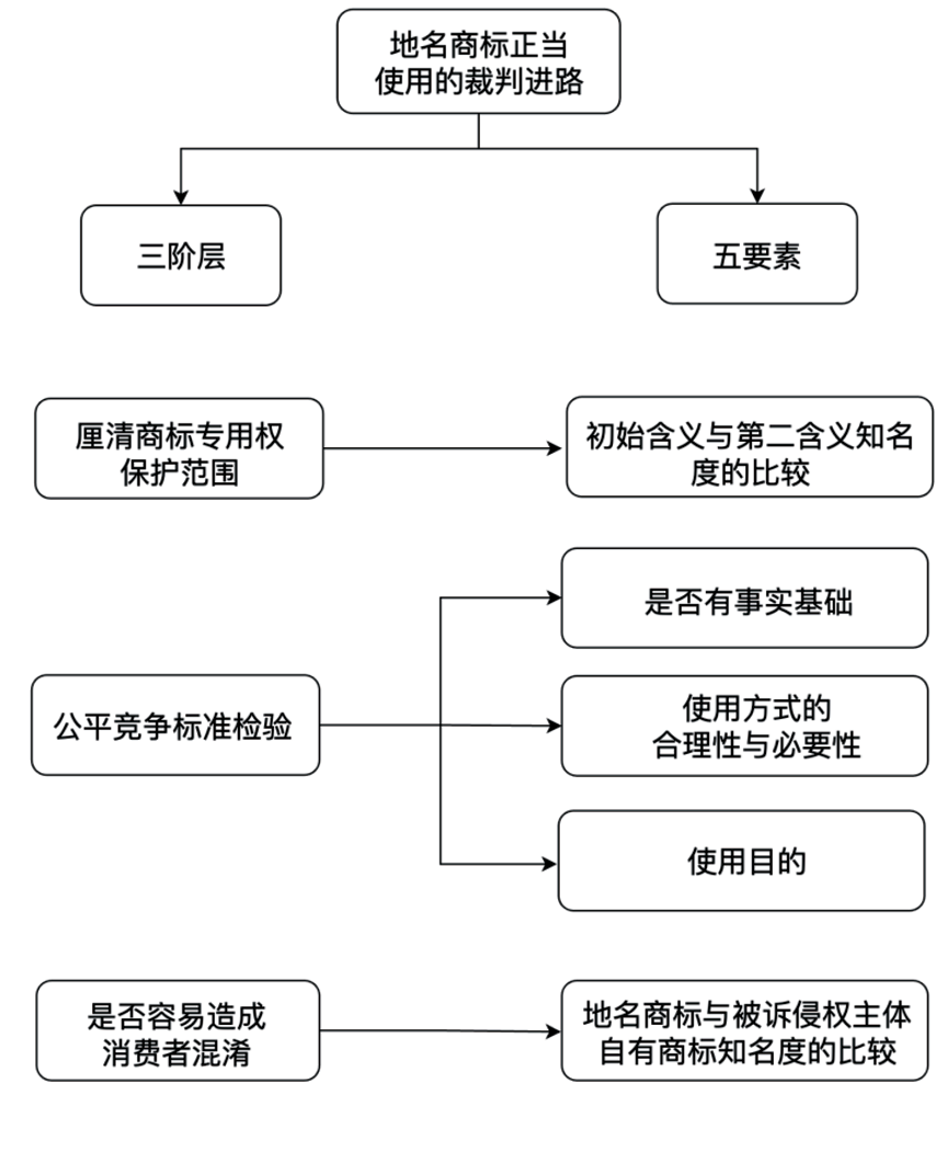 地名商标正当使用案件中,从正当使用制度隐含的三种利益冲突出发,可将其认定进路分为三阶层:首先,为保障商标权人的商标专用权,应厘清其商标专用权的范围。通过对比地名标识的初始含义与第二含义的知名度,确定地名标识在消费者心中的信息记忆,为地名标识的公有领域和私权划清界限。其次,以保障市场公平竞争为标准,判断被告是否出于公平竞争的需求而使用地名商标。应从被告使用地名标识是否有相应的事实基础,使用方式的合理性与必要性、使用目的三个要素综合判断。最后,从消费者的视角出发,判断被告对地名标识的使用是否容易造成混淆,影响消费者的知情权与自由选择权。地名商标与被诉侵权主体自有商标知名度的比较,对消费者是否容易混淆有一定影响。上述三阶层、五要素的逻辑脉络,即为判断地名商标正当使用的认定规则,如下图所示: