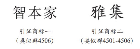 结合本案分析,首先,依据《类似商品和服务区分表》,诉争商标指定使用的“调解;仲裁;有关许可的法律服务;为他人进行合同谈判的法律服务”等与引证商标一、二核定使用的服务属于同一种服务。其次,从消费者认知角度出发,诉争商标不仅完整地包含他人在先已经核准注册的文字商标,且整体缺乏较为突出的显著部分,以消费者的一般注意力,通常会优先识别“智本家”“雅集”等已存于市场的商标并与之产生联系。若两者共存于市场,势必会使消费者对服务来源产生误认甚至引发错误的购买决策,而这有悖于《商标法》的立法初衷。故法院认定诉争商标与引证商标一、二构成近似商标。