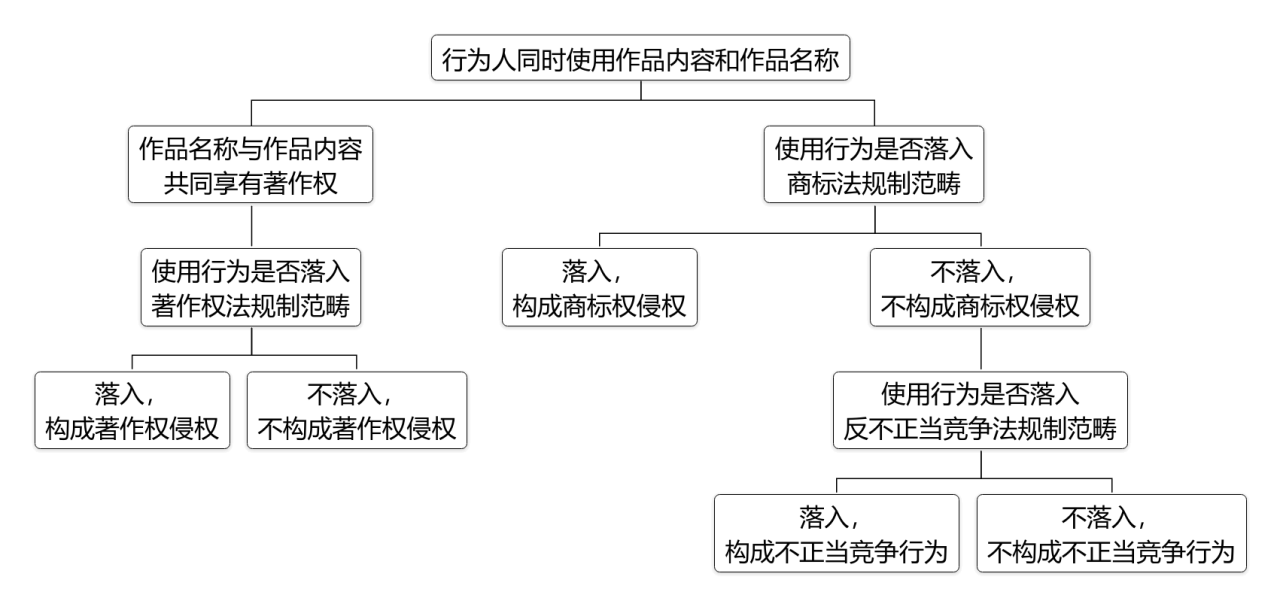 行为人同时使用作品名称和作品内容的侵权表现形式,指的是行为人出于全面仿制的目的,不仅利用了权利作品内容所具有的文化价值,还存在攀附权利作品名称商业价值的不正当意图。在该侵权表现形式背后,由于行为人同时不正当使用了作品名称和作品内容,对权利人的文化利益和商业利益造成双重侵害,故可能构成著作权侵权、商标权侵权和不正当竞争行为。在具体认定上,若行为人使用的作品内容落入著作权法规制范畴,则该侵权表现形式背后存在著作权侵权行为;若行为人使用的作品名称落入商标法规制范畴,则该侵权表现形式还存在商标权侵权行为;若行为人使用的作品名称未落入商标法规制范畴,但落入不正当竞争法规制范畴的,则该侵权表现形式背后虽然不存在商标权侵权行为,但还存在不正当竞争行为。