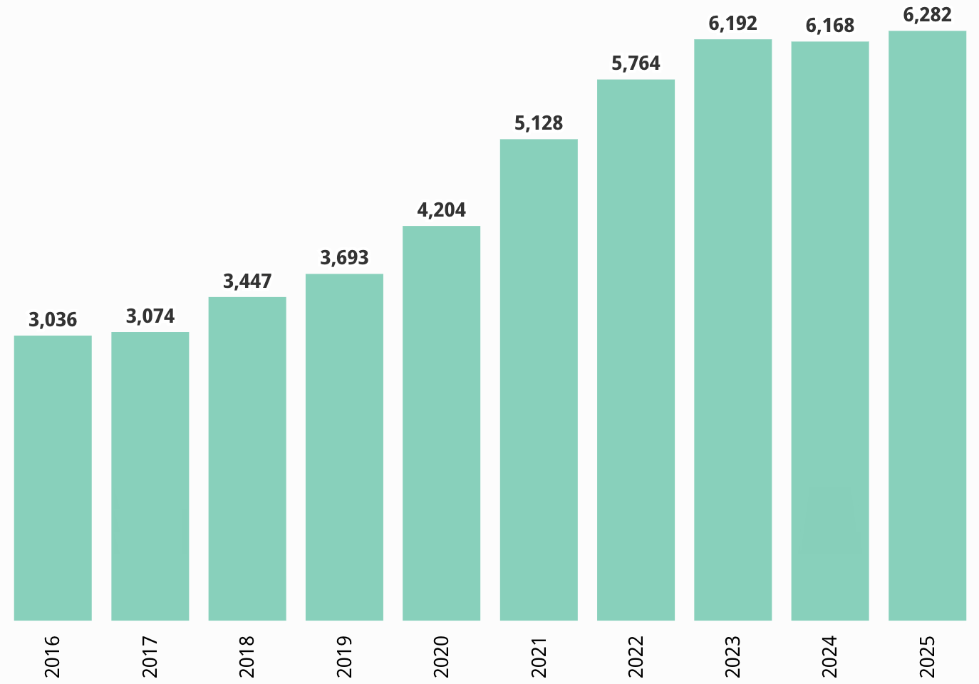 2025年,中心管理了6282件由商标权利人提起的域名争议案件,较2024年增长1.8%,是该项服务自25年前启动以来案件数量最多的一年。至此,中心累计处理的域名争议案件已超过8万件,包括7万余件通用顶级域(gTLD)案件和近1万件国家代码顶级域(ccTLD)案件。