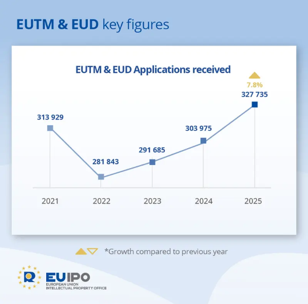 更多 >>中国知识产权律师网从EUIPO获悉,2025年,欧洲知识产权局(EUIPO)共收到327,735份欧盟商标(EUTM)和欧盟外观设计(EUD)申请。这是该机构自1996年开始受理申请以来,年度知识产权申请数量的最高纪录。