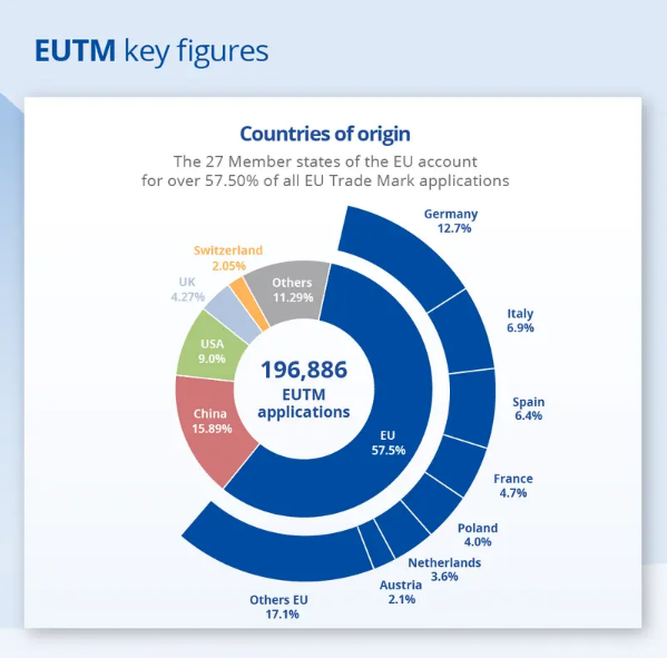 欧盟以外地区方面,来自中国的申请量持续增长,增幅达13.3%(占欧盟商标总申请量近16%)。美国(9%)和英国(4.2%)位列申请量前三。