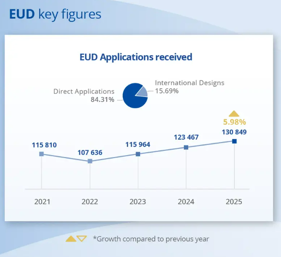 2025年欧盟外观设计需求持续增长。EUIPO共收到130,849件外观设计申请,同比增长6%,连续第二年刷新历史纪录。