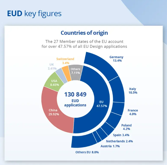 非欧盟地区申请首次占据主导地位,占欧盟外观设计申请总量的52%。