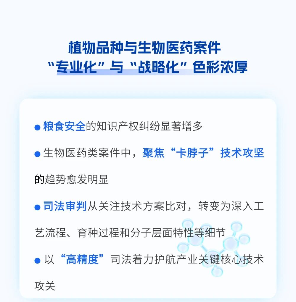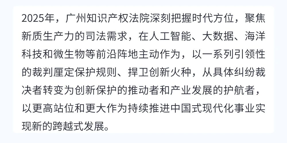 2025年,广州知识产权法院技术类知识产权审判逐步成为参与全球科技治理、塑造创新生态的核心力量。白皮书指出,该院的审判工作不仅在案件数量上实现突破,更在专业化、系统化、引领性方面取得显著进展,实现从“裁判纠纷”到“引领规则”的转型。其中,技术类案件结构发生深刻变化,覆盖至海洋、微生物和流媒体等全新领域案件;该院通过对创新成果分类保护、精准识别恶意诉讼等方式,系统治理权利滥用行为,守护培育创新的法治土壤;围绕植物品种、生物医药等关键领域与“卡脖子”技术难题,该院以“高精度”司法护航产业关键核心技术攻关;在审理新兴领域案件中,该院还致力提炼价值导向清晰的裁判规则,助推科技创新实现新质转变。