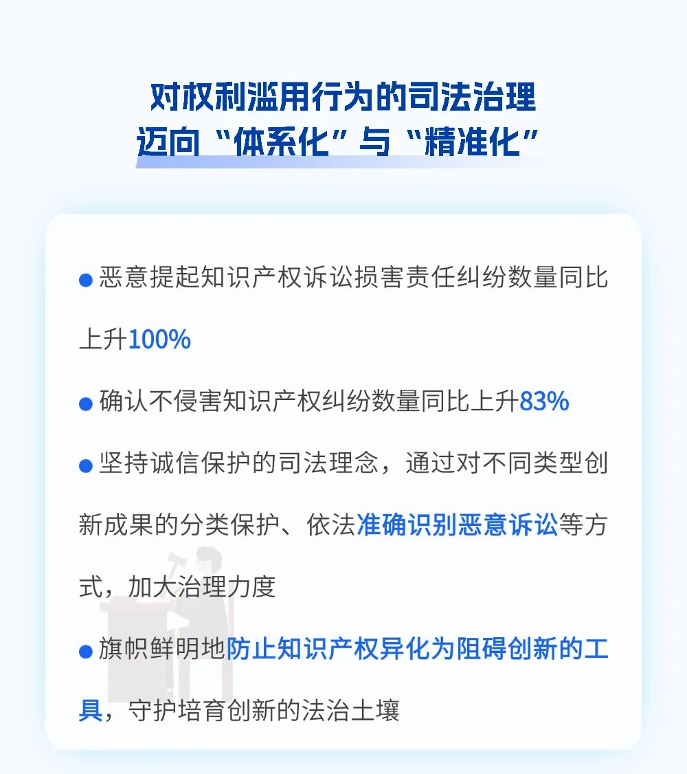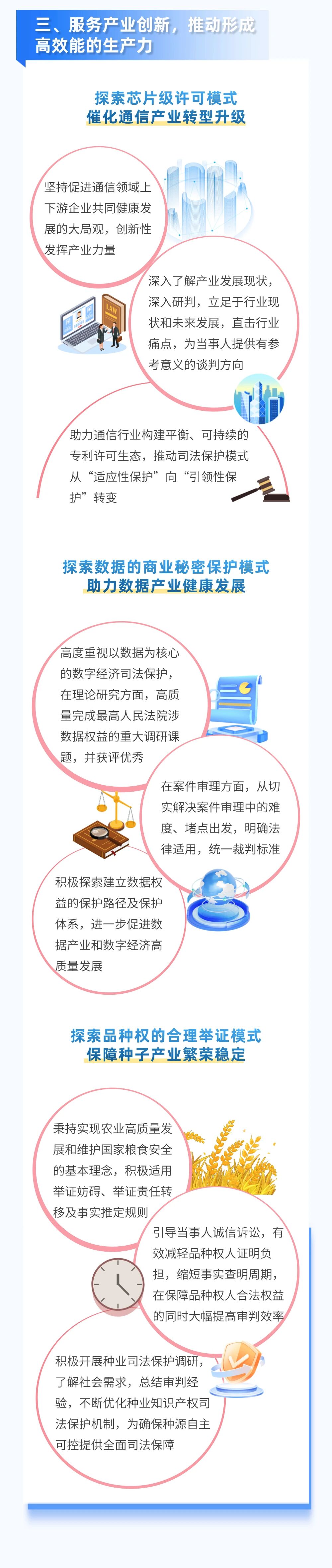 在服务产业创新方面,该院通过探索适应新业态的司法保护模式,精准护航重点产业发展。在通信产业领域,全面了解产业发展现状,深入研判,立足于行业现状和未来发展,直击行业痛点,为当事人提供有参考意义的谈判方向,助力通信行业构建平衡、可持续的专利许可生态,实现“最大公约数”,一揽子化解矛盾。在数据产业领域,该院积极明确法律适用,统一裁判标准,探索建立数据权益的保护路径及保护体系,并高质量完成最高人民法院涉数据权益的重大调研课题,获评优秀。在种子产业领域,该院积极适用举证妨碍、举证责任转移及事实推定规则,引导当事人诚信诉讼,在保障品种权人合法权益的同时大幅提高审判效率。积极开展种业司法保护调研,了解社会需求,总结审判经验,不断优化种业知识产权司法保护机制,为确保种源自主可控提供全面司法保障。