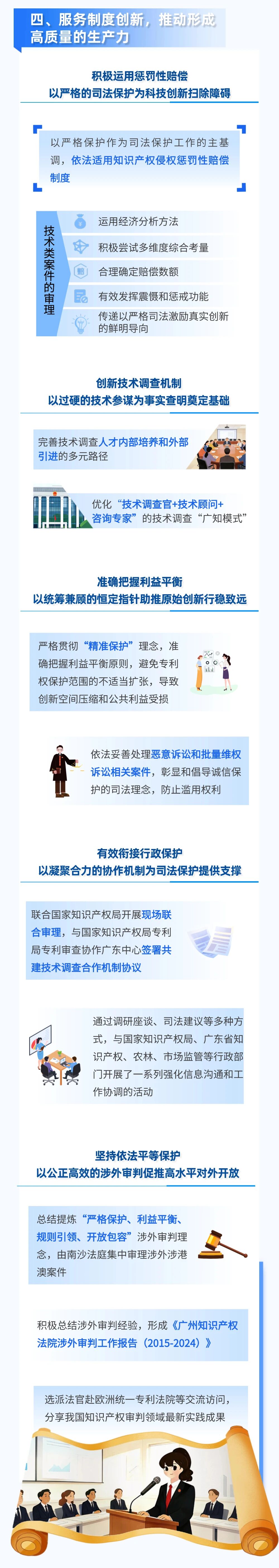 在服务制度创新方面,积极推动构建优质高效的知识产权司法保护制度。该院以严格保护作为司法保护工作的主基调,依法适用知识产权侵权惩罚性赔偿制度,有效发挥震慑和惩戒功能。不断创新完善技术调查机制,“技术调查官+技术顾问+咨询专家”技术调查“广知模式”已成为破解审判难点的关键利器。严格贯彻“精准保护”理念,准确把握利益平衡原则,保障创新空间并防止权利滥用。有效衔接行政保护,联合国家知识产权局开展现场联合审理,与国家知识产权局专利局专利审查协作广东中心签署共建技术调查合作机制协议,汇聚合力。坚持依法平等保护,提炼并践行“严格保护、利益平衡、规则引领、开放包容”涉外审判理念,由广州知识产权法院南沙法庭集中审理涉外涉港澳案件,进一步强化专业化审判建设,积累涉外审判经验,参与全球科技治理。
