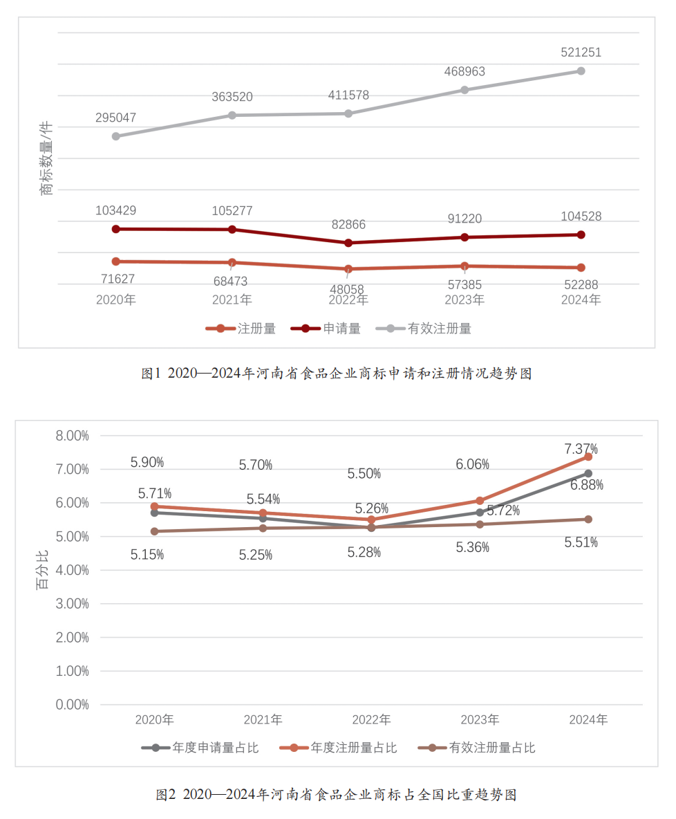 更多 >>摘 要:河南省作为我国农业大省和食品工业强省,食品产业是其重要经济支柱。本文通过梳理河南省食品企业近五年国内商标申请量、近十年国际商标申请量、地理标志商标注册量等相关数据,系统分析河南省食品企业国内、国际商标申请注册趋势及地理标志发展现状,剖析存在的政策落地效能不足、商标品牌建设保护意识薄弱、地理标志商标数量偏少、区域品牌产业协同效应不足、国际竞争力不强等问题,并提出相应对策建议,为推动河南省从“食品加工大省”向“食品品牌强省”转型 , 加强商标品牌建设,提高市场竞争力提供参考。