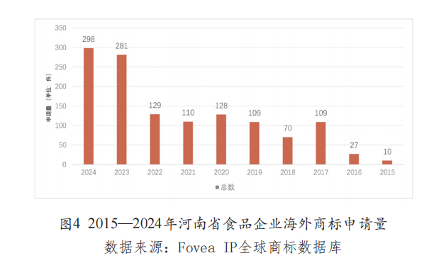 2015―2024年期间,河南省食品企业海外商标申请量呈快速增长趋势,从2015年的10件升至2024年的298件(见图4),年均增长率40.4%。这一增长趋势说明河南省食品企业品牌国际化保护意识显著增强。