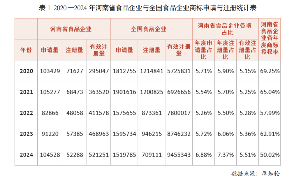 一是专业人才匮乏。企业对相关商标审查知识掌握欠缺。如2022 年4月国家知识产权局发布的《餐饮行业商标注册申请与使用指引(试行)》中常见的误认、缺乏显著特征等情形,导致近五年食品业商标授权率由2020年的69.25%大幅下滑至2024年的50.02%(见表1)。二是防御性布局欠缺。企业对防御性商标布局意识薄弱,产品品类众多却往往只注册食品类单一类别,为后续发展留下隐患。三是海外布局滞后。国际市场商标布局不足,制约了企业海外市场拓展步伐。四是维权能力薄弱。企业商标监测与维权响应能力存在短板,维权周期长、赔偿额度低等问题导致企业维权成本高、收益有限,进一步削弱了食品企业的维权意愿。