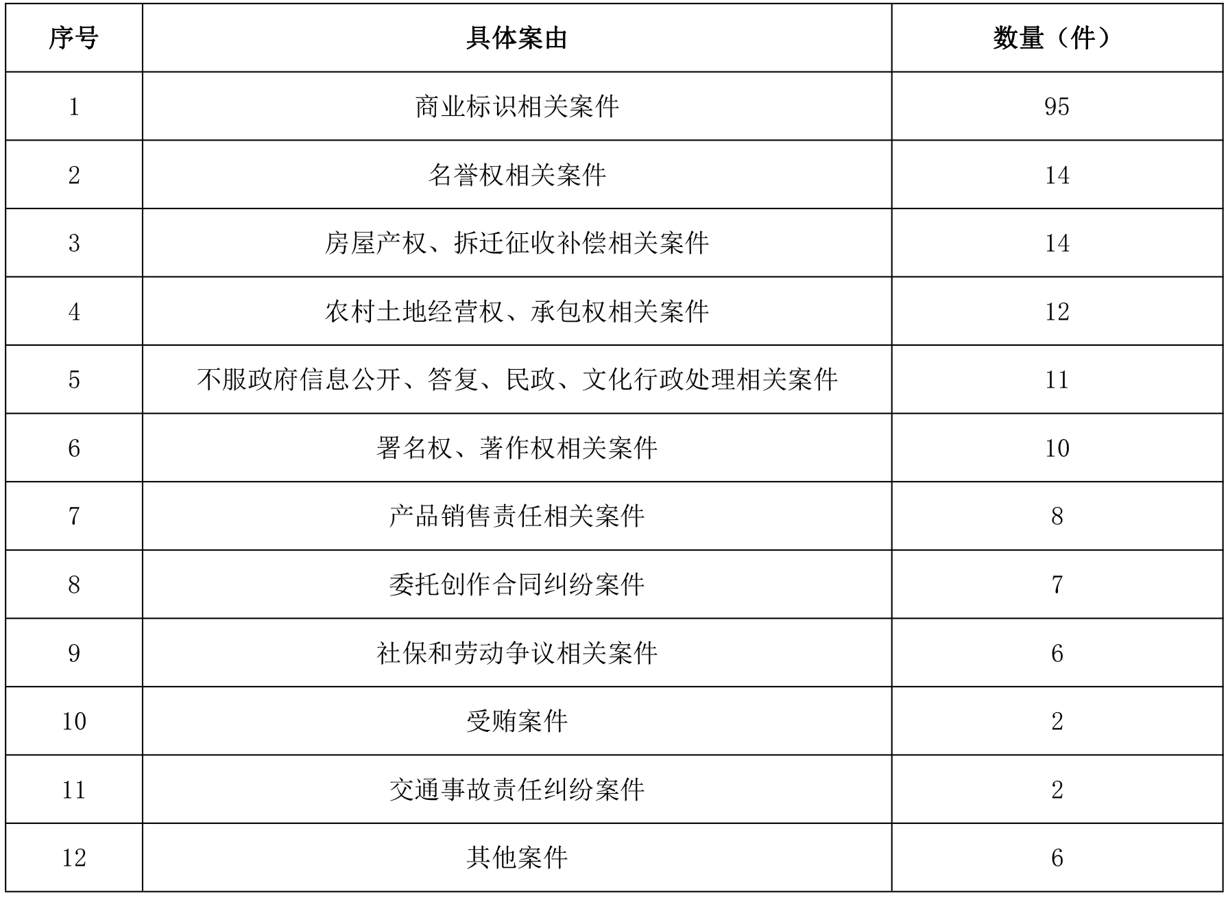 2024年3月,笔者使用“地方志”作为检索词,在中国裁判文书网中检索带有“地方志”3字的裁判文书,经过甄别筛选,最终得到使用地方志证据的案例文书187篇,即对应187个案件。这些案件可进一步细分为“商业标识相关案件”“名誉权相关案件”“房屋产权、拆迁征收补偿相关案件”“农村土地经营权、承包权相关案件”“不服政府信息公开、答复、民政、文化行政处理相关案件”“署名权、著作权相关案件”“产品销售责任相关案件”“委托创作合同纠纷案件”“社保和劳动争议相关案件”“受贿案件”“交通事故责任纠纷案件”及“其他案件”12个小类(每个小类案件具体数量情况见表1)。