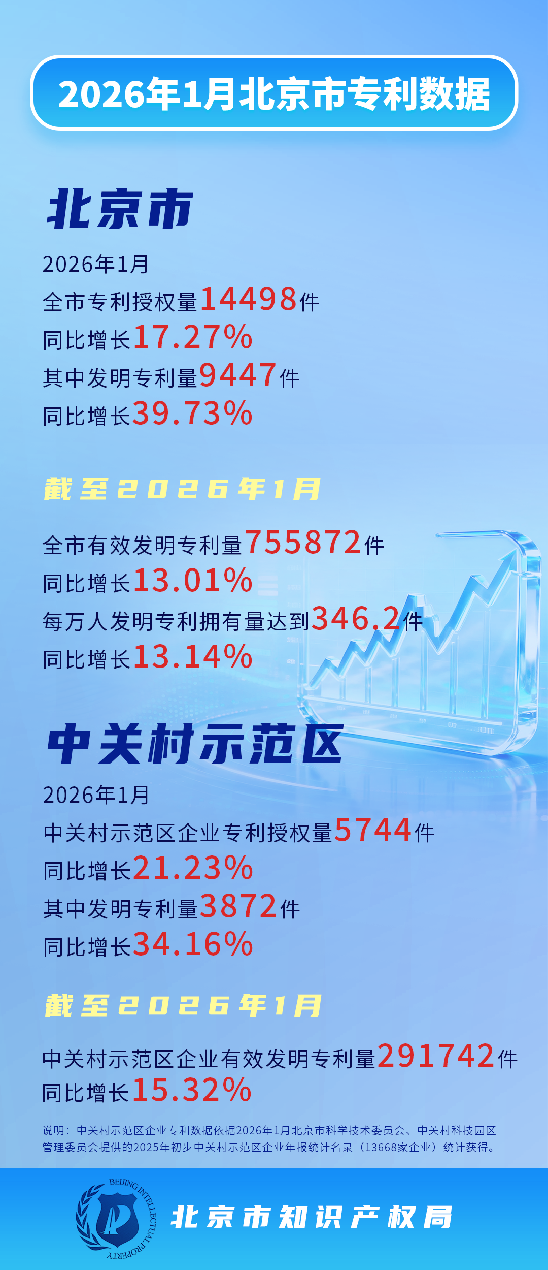 2026年1月,中关村示范区企业专利授权量5744件,同比增长21.23%,其中发明授权量3872件,同比增长34.16%。截至2026年1月,中关村示范区企业有效发明专利量291742件,同比增长15.32%。