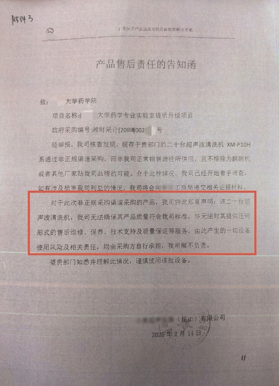 此后,该生产商应被告所求向招标单位发函称:该批设备系非正规渠道采购的产品(窜货);不提供任何形式售后维修、保养、技术支持及质量保证等服务(拒保);望知悉,谨慎使用该批设备。