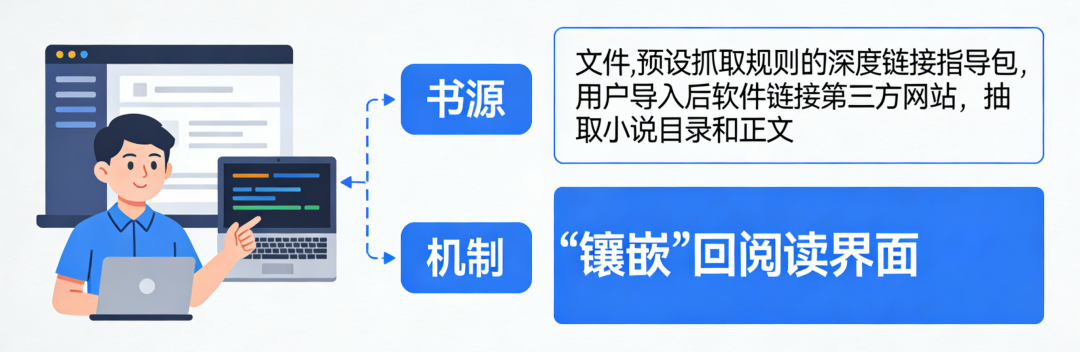 葛某某开发的“×读”软件及其“书源”机制,正是深度链接技术的深度应用。“书源”文件本质上是一个个预设了抓取规则的深度链接指令包。当用户导入某个“书源”后,软件便能按照指令链接至第三方网站,抓取特定小说的目录和正文内容,并“镶嵌”回“×读”软件的阅读界面之中。在用户感知体验上,自己始终是在一个干净、统一的“阅读”软件内享受完整的阅读服务,全然不知内容实则来自网络深处散布的各处盗版站点。