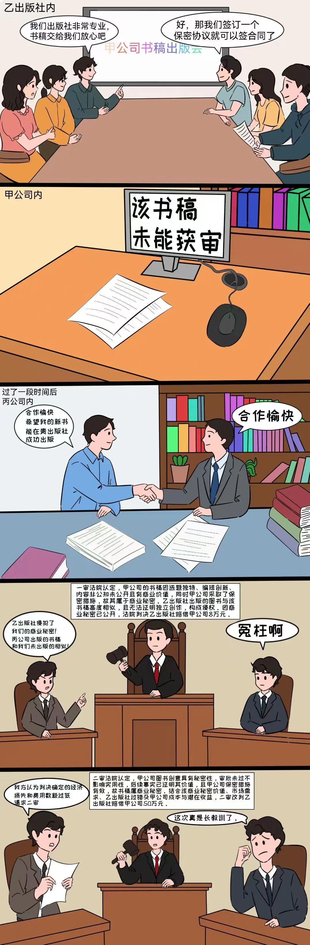 一审法院经审理后认定,甲公司策划的书稿选题独特、编排创新,内容选择非公知信息且未公开。书稿具有商业价值,虽未通过初审,但具有其价值。甲公司采取了保密措施,与相关人员签订保密协议并限定知悉范围。乙出版社出版的图书与甲公司书稿高度相似,无法证明系独立创作,构成侵权。鉴于该商业秘密已公开,法院判决乙出版社向甲公司赔偿8万元。甲公司认为原一审判决确定的经济损失和合理费用数额过低,遂提起上诉;乙出版社否认侵权行为,同样提起上诉。